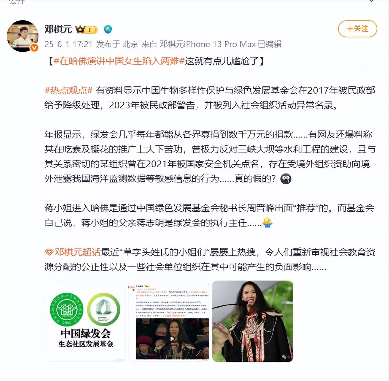 网友邓棋元曾于6月1日发微博称:有资料显示中国生物多样性保护与绿色发展基金会在2017年被民政部给予降级处理,2023年被民政部警告,并被列入社会组织活动异常名录。
