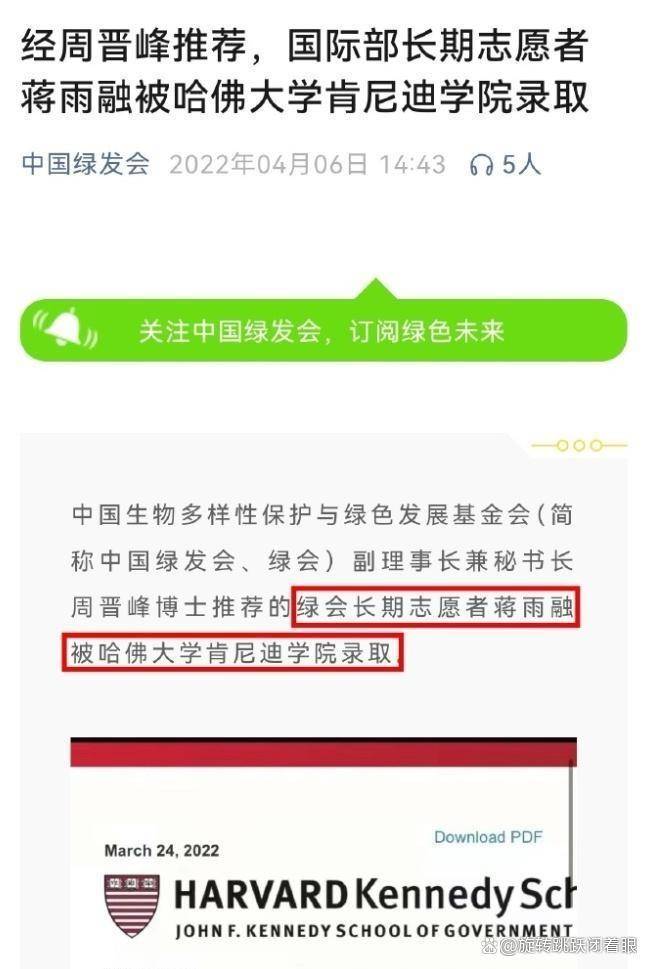 蒋雨融的父亲蒋志明是中国绿发会专项基金执行主任,她正是在绿发会副理事长周晋峰的推荐下进入哈佛的。