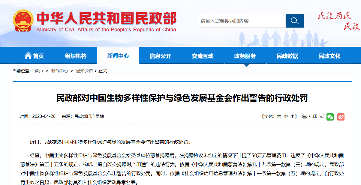 而且,这个中国生物多样性保护与绿色发展基金会因在捐赠协议未约定的情况下计提了50万元管理费用,违反了《中华人民共和国慈善法》第五十五条的规定,构成“擅自改变捐赠财产用途”的违法行为。受到过民政部处罚。