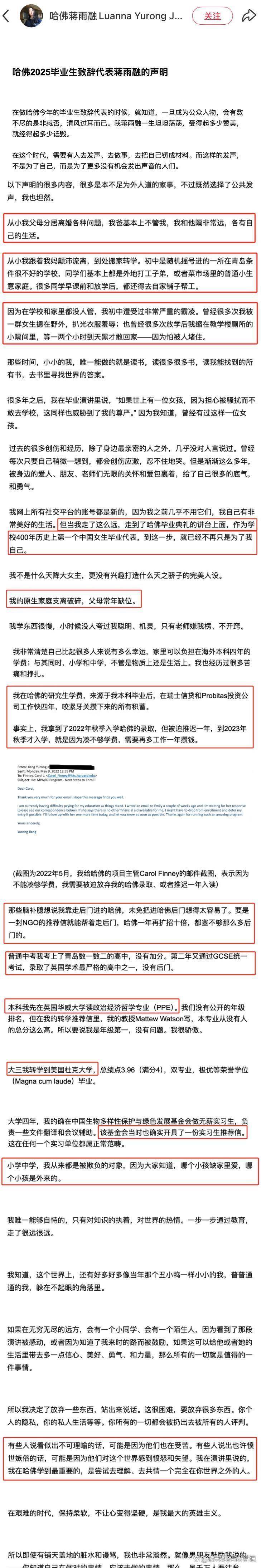 更重要的是,在当前的舆论环境下,民众对精英教育的反感程度日益加深,而蒋雨融的出身背景、求学经历、演讲内容,都精准踩中了公众的痛点。