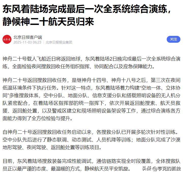 在返回保障方面,相关工作也做得十分到位。东风着陆场已经完成了夜间低温环境下的全系统演练,搜救车辆、医疗救护等全链条已待命。为应对11月的低温黑夜,照明系统也进行了升级,3架照明无人机能形成立体照明,配合车载广场灯,确保着陆现场如白昼般明亮。