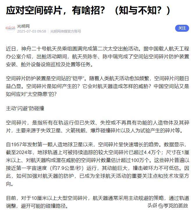 另外,航天员也会定期出舱,给空间站的重要管路和舱外设施加装额外的防护装备。通过这种“定期巡检、主动加固”的方式,空间站增强了应对碎片撞击的能力。