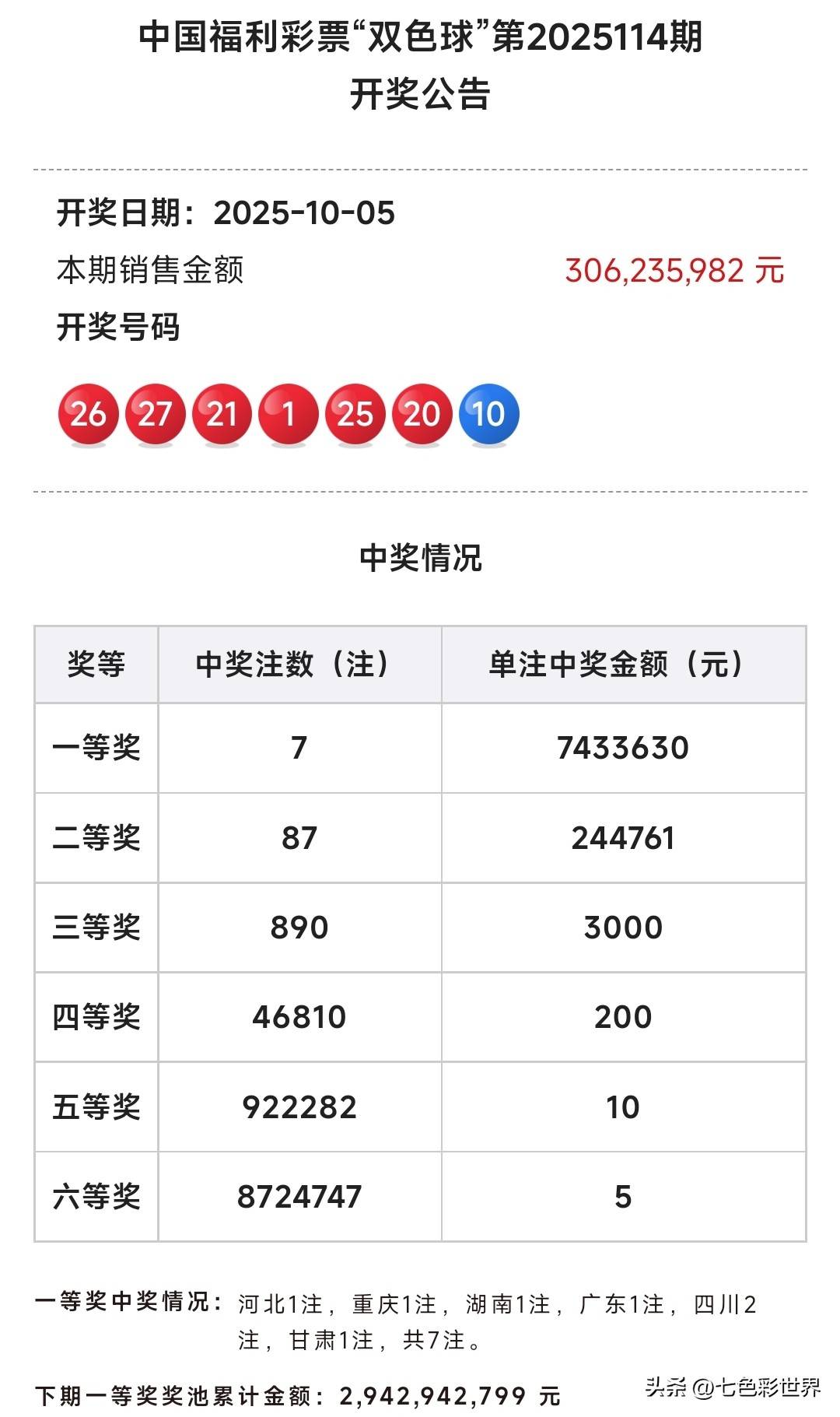 本期双色球具体开奖号码为:红球01、20、21、25、26、27+蓝球10。