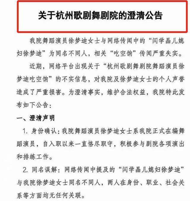 一纸声明试图将漫天谣言直接按死:剧院在职的徐梦迪与闫学晶儿媳“同名不同人”,二者毫无关联,请外界停止骚扰。