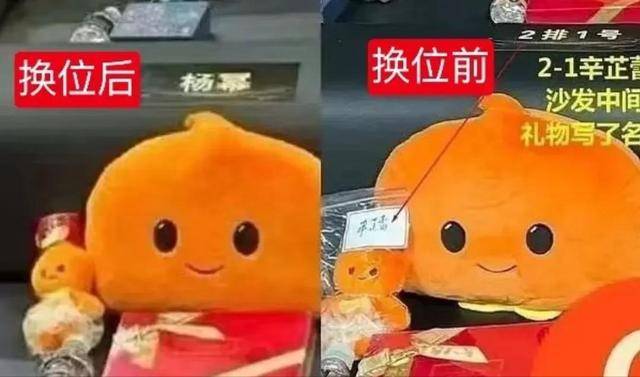 更有意思的是,不光人坐错了,东西也摆错了,有现场照片显示,主办方给每个艺人准备的定制玩偶和礼盒,也跟着挪位置了。
